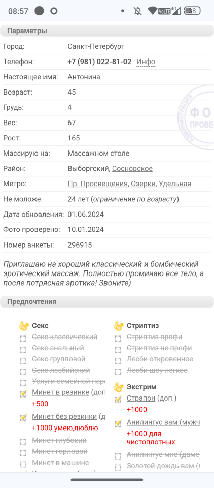 Фото не прикладываю, пишу с телефона, все есть в анкете на РД, но там не похоже на себя. Мне кажется что я видел ещё ее анкету на РД, тоже просвет и вот там фото ближе к реальным. Сейчас найти не могу, анкета проверенная отключена и та видимо тоже и не бьется по поиску. Позже скину. Там ещё на главной фото крупным планом голова с морем сзади.