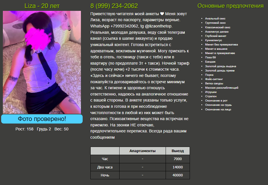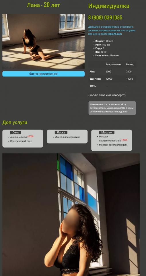Вот и у меня с ней такая же хрень, списывался несколько раз но до того как установила предоплату 3000 и оплату её такси. С какого хера клиент должен оплачивать ей такси? Вообще мутная какая то, всё больше рекламирует свой телеграм и типа фотки высылаю + 900. Может и не встречается совсем для интима , 3000 предоплаты переведёшь , она ответит - Не могу, такие дни . И скинет три фотки с голой титькой и - пока, дрочи.