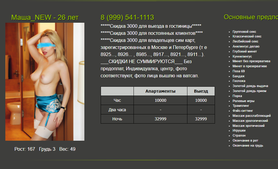 Когда крайний раз у нее были? Или может кто был у нее недавно сможет прояснить такой момент: не знаю на сколько правда или нет, но под одной из анкет видел комментарий (который впоследствии был удален или создана новая анкета) про то, что якобы она только собирает инфу о клиентах (непонятно для каких целей), а реальных встреч нет. Что думаете по этому поводу?