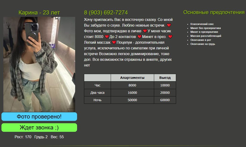Принимает на Республиканская, 6, быстро договорился, приехал. Вот что увидел: фото ее, но наверное, не очень свежие, придираться не хочется, встретила в секси платьице красном, красивая девушка восточной внешности. Очень приятный голос, есть много мелких татух на руках и груди. Очень контактная, не ушлая, нежная, в общем максимально приятная! Возраст я думаю около 26-27, грудь приятная 1.5-2, рост 170, в целом