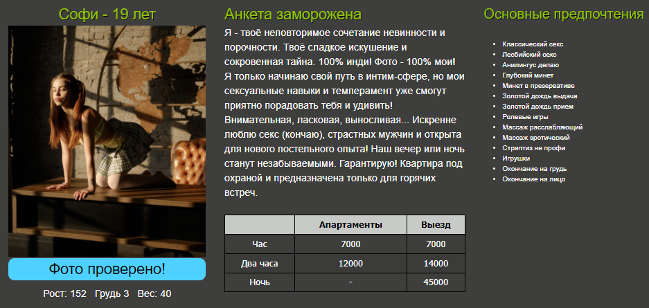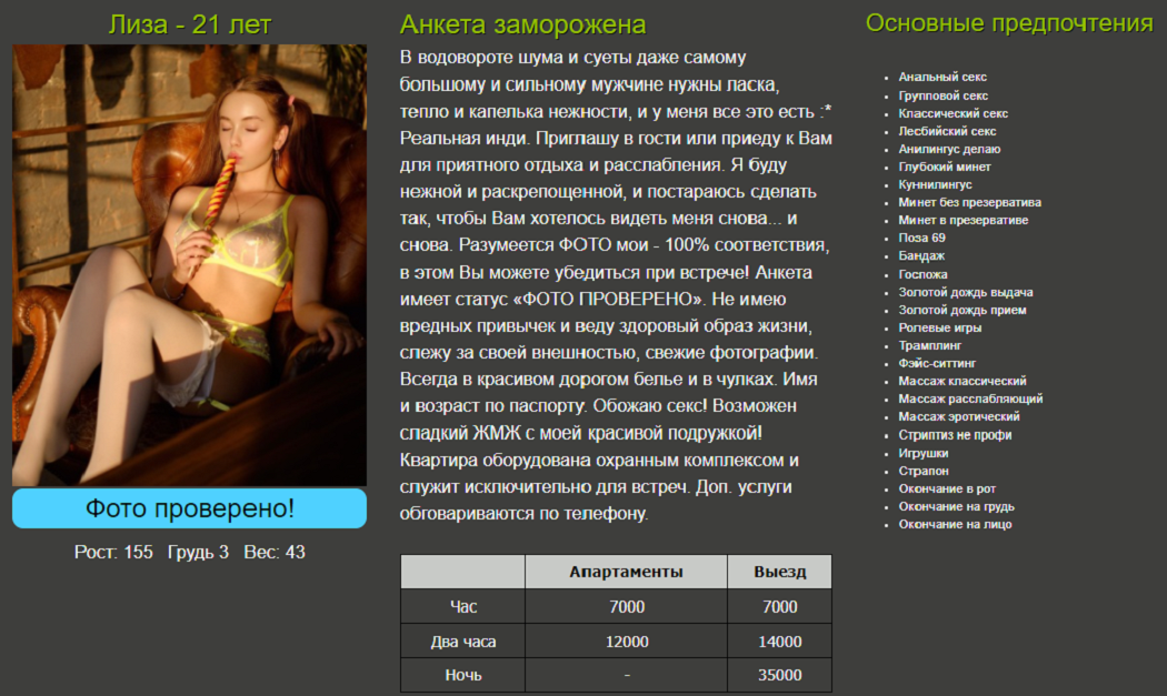 раньше у данной девушки был ценник 7тысяч и отзывы, не помню только на каком сайте, хорошие типо уровень москвы, о ней уже были тут отзывы, решил тоже посетить и понять почему ценник упал в два раза, но эта самая настоящая наркоманка под кайфом принимающая в наркопритоне, как я понял за дозу, я сразу ушел, остерегайтесь, жаль что отзывы нельзя оставлять на сайтах где они зареганы, так как в таких местах особо опасно появляться для жизни и для здоровья
