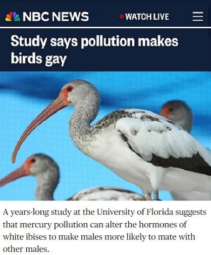 К такому неутешительному выводу пришли ученые, наблюдавшие за поведением белых ибисов, экосистема которых длительное время подвергалась заражению ртутью. Последняя вызвала у самцов гормональные сбои и они начали спариваться с такими же самцами.