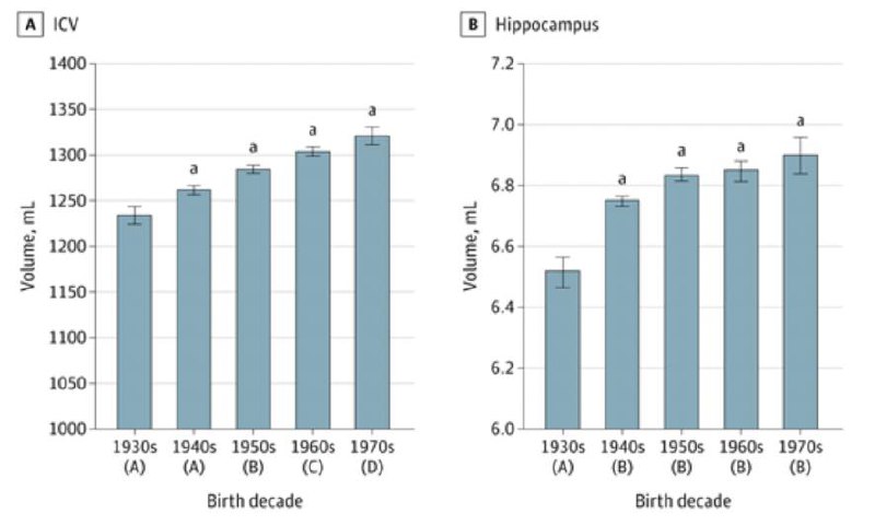 Объём мозга у людей растёт, как показали исследования американский нейрофизиологов. Наряду с ростом объёма увеличивается площадь коры и гиппокампа. Главное следствие таких эволюционных изменений – рост когнитивных возможностей людей и уменьшение вероятности деменции в пожилом возрасте.