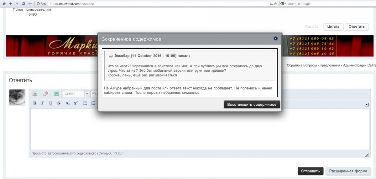 На Амуре набранный для поста или ответа текст никогда не пропадает. Не поленись и начни набирать снова. После первых набранных символов внизу появится надпись о том, что сохранилось что-то из прошлых записей, кликаешь на неё, вылетает окошко, опять кликаешь на него- появляется твой набранный ранее текст.