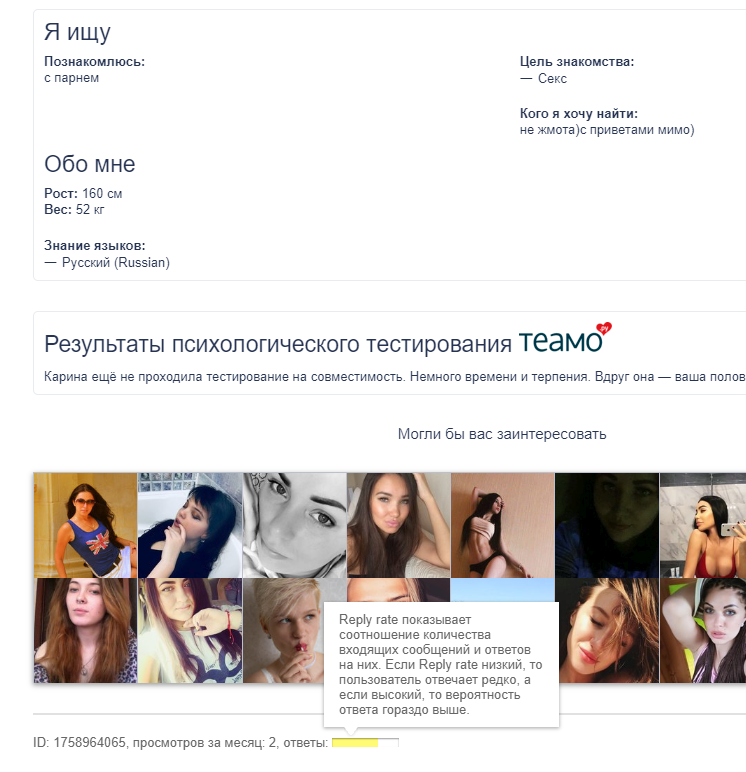 Заскринил ее профиль на мамбе, по риплай рэйту видно, что реально отвечала и еблась, пока была онлайн :934c894b256b8195985ff2f92382adf