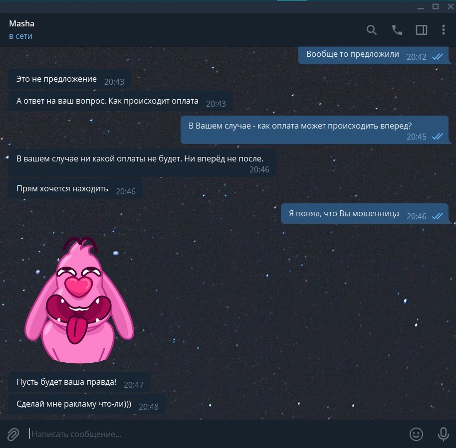 Поэтому настаиваю на доказательствах в виде скринов: или переписка, или объявление в профильной группе.