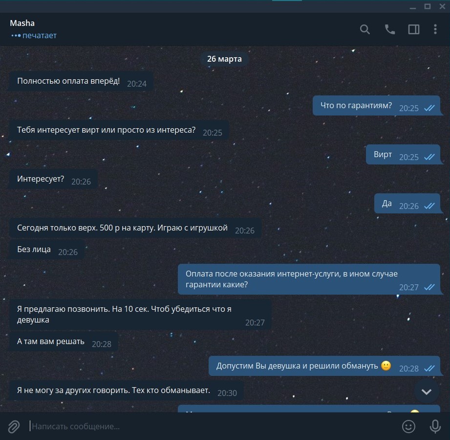 Ну, тут факт мошенничества не доказан совершенно. Оба участника торговых отношений в данном случае анонимны и находятся в интернете, услуга тоже производится через интернет. Исполнителю нет резона демонстрировать своё тело без получения денег, как и заказчику платить вперёд без гарантия совершения сделки. Тут нужна либо третья сторона, как в случае платёжного оператора при покупках через интернет, где гарантией является репутация оператора, либо верить на слово, в данном случае платить вперёд.