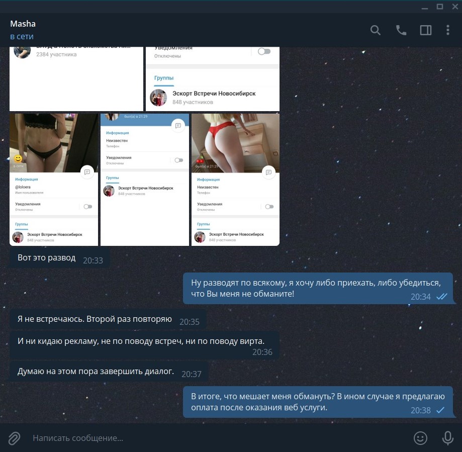 Было бы полезнее, чтобы выложили всю переписку с ней, от начала и до конца, где нашли ее, какую рекламу она давала или кто посоветовал. Интересно, страница во Вконтакте у нее зарегистрирована с 2008 г. (по первой ее записи на стене), наверное она начинающая проститутка, а может именно мошенница. Кто ее знает или тестировал, поделитесь мнением.
