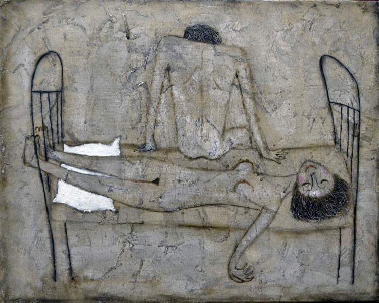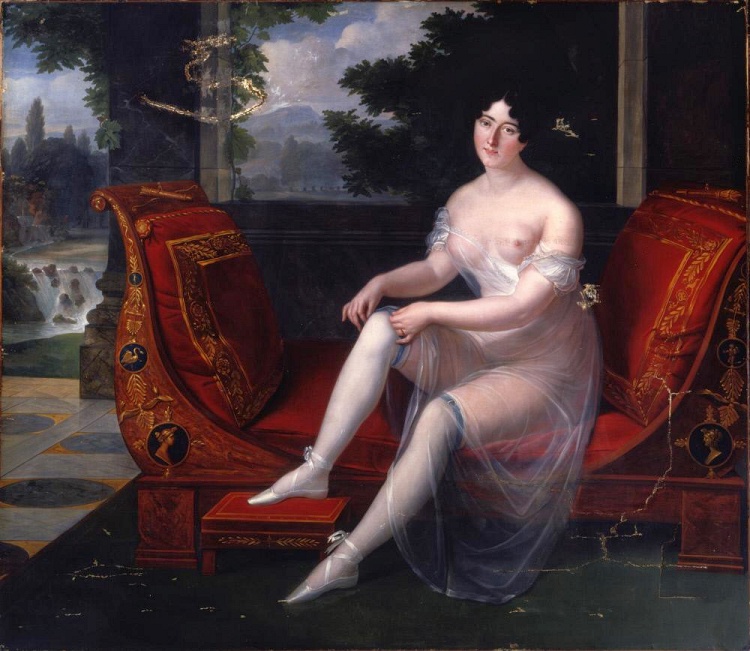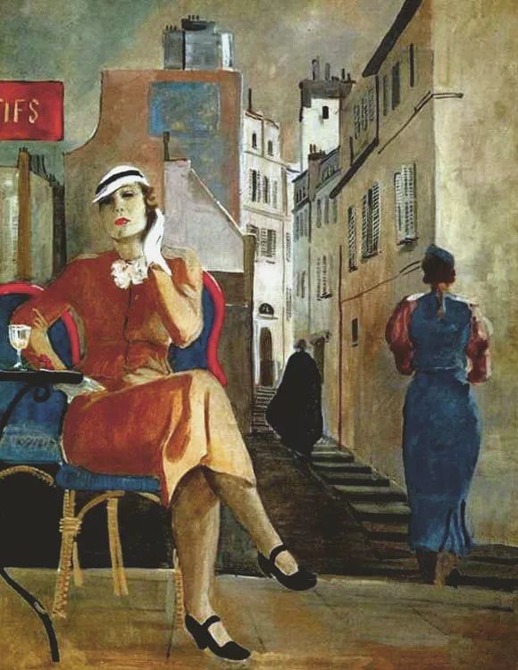 Контраст между мускулистыми фигурами советских трудящихся девушек и томной парижанкой в кафе. Кстати, порядочные женщины в то время (1935 год) в одиночку по кафешкам не ходили, так что очевидно - ждет клиента