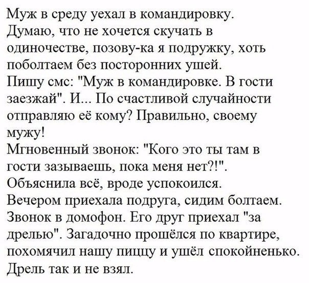 На следующее утро Гену с налитыми кровью глазами едва удержали от расправы с помощью аварийного топора над перетрухавшим Лёхой. Дома они с женой отметили возвращение, а потом перешли к более интимным делам, поставив в магнитофон свою любимую кассету. И что же услышали из динамиков? Ну, вы поняли. Что можно объяснить в такой момент? Дорогая, это не то, что ты подумала?"