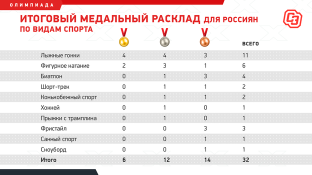 Если бы золото выиграли,. скажем, в биатлоне (хотя бы одно в эстафете), коньках (на одной из дистанций), во фристайле (я там плохо разбираюсь, но часто читаю в новостях о победах на каких-то этапах Кубка мира) и в хоккее, это было бы чистое третье место. Где-то откровенно не повезло. В целом, у нас неплохая команда, многие спортсмены в первой десятке в своих видах и не по одному. Однако в текущей ситуации по подсчету нужны безусловные лидеры, как лыжи у мужчин, или фигурное катание в целом (как команда) или фигуристки-одиночницы.