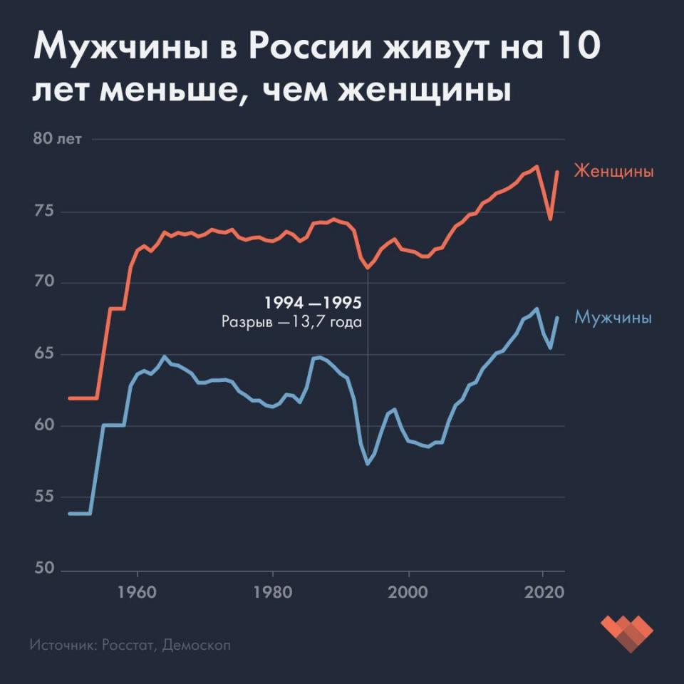Женщины в России живут гораздо дольше мужчин. По предварительной оценке Росстата, которую приводит РБК, ожидаемая продолжительность жизни (ОПЖ) женщины, родившейся в 2022 году, на 10,2 года больше, чем мужчины, — 77,8 года против 67,6. Эту разницу называют гендерным разрывом, и, по оценке ООН, в России он больше, чем в любой другой стране мира.