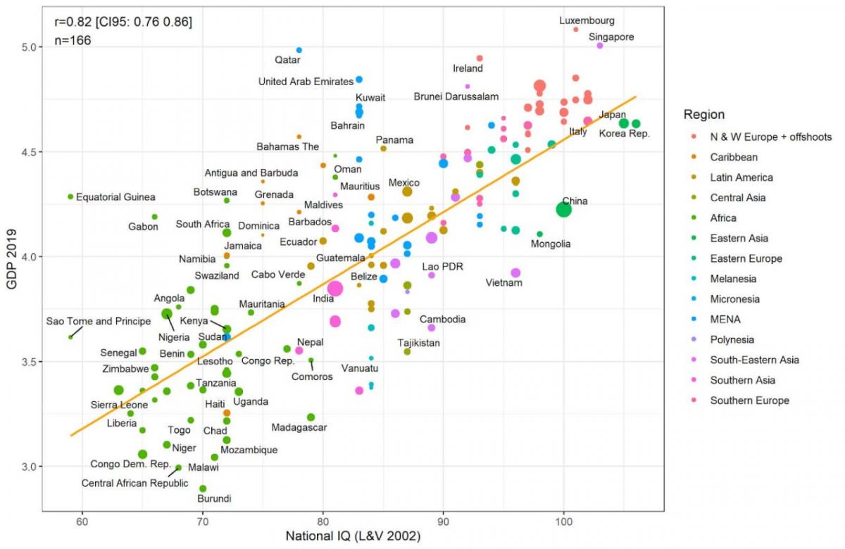 Обнаружили интересную статью, опубликованную в 2022 году в журнале Mankind Quarterly. Исследователи отмечают, что показатели коэффициента интеллекта населения (IQ) государств и ВВП на душу населения сильно связаны - приблизительно 70% разницы в национальном благосостоянии могут быть объяснены только лишь IQ.