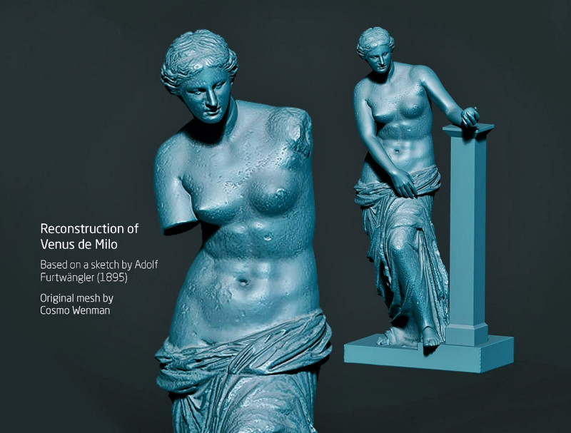 Дело в том, что с Милоса были привезены (кроме двух больших кусков) отколовшиеся фрагменты - часть руки, кисть с яблоком, носок ноги и часть постамента. Причем на постаменте прослеживалась четкая надпись: