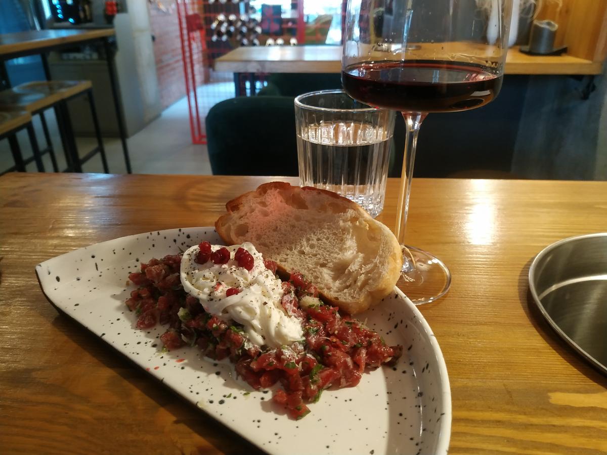 4) Тартар из говядины со страчателлой, брусникой и чиабаттой (690р)