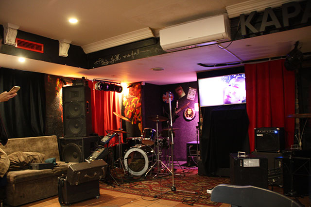 Основной зал вмещает человек 40–45. Зал у входа, который с барной стойкой — ещё человек 20, но сцену оттуда видно только с одного столика (его недавно поставили, раньше там было два игровых стола что-то типа футбола или хуй его знает).
