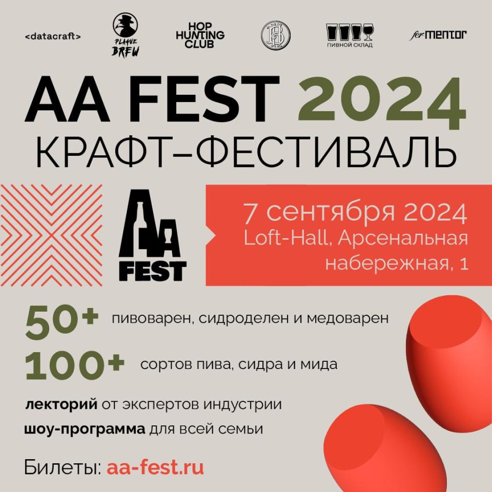 В этом году AA FEST соберет больше 50 лучших пивоварен, медоварен и сидроделен со всей России и стран СНГ, представив более 100 классических, исторических, экспериментальных и безалкогольных сортов. Весь день гости фестиваля смогут наслаждаться безлимитным пивом, вкусной едой, live-музыкой и шоу-программой для всей семьи, а также лекциями от ведущих экспертов крафтовой индустрии.