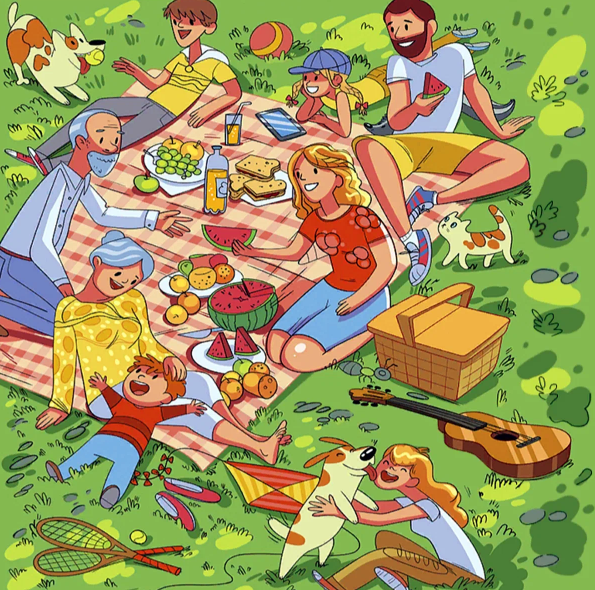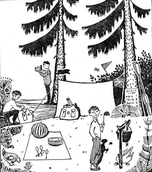 Могу предположить, что в палатке может находиться Анжела, которая не скидывалась и в дежурствах не участвует. Пете ложка и тарелка не нужны, так как он уже навернул с котелка половником, об этом говорит его счастливое лицо (хотя лицо может быть счастливым от того, что он уже побывал в палатке). А недовольное лицо Коли намекает на то, что он не может найти презервативы.