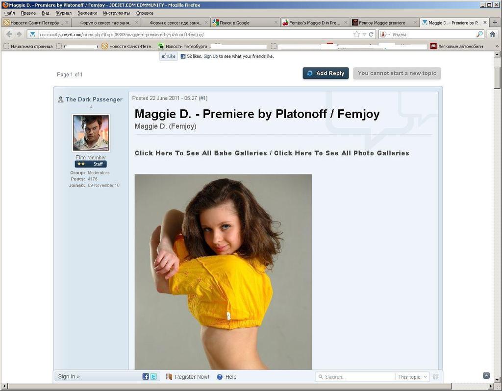 Femjoy's Maggie D in Premiere , и будите удивлены количеством фоток этой особы. Видно русская модель некоего Платонова.