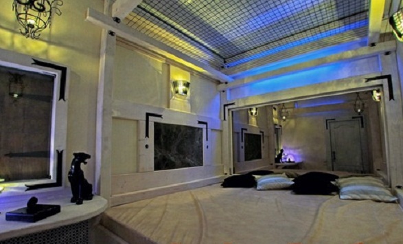 Антураж сауны средневиковье, везде развешено холодное оружие, кандалы и т.д.