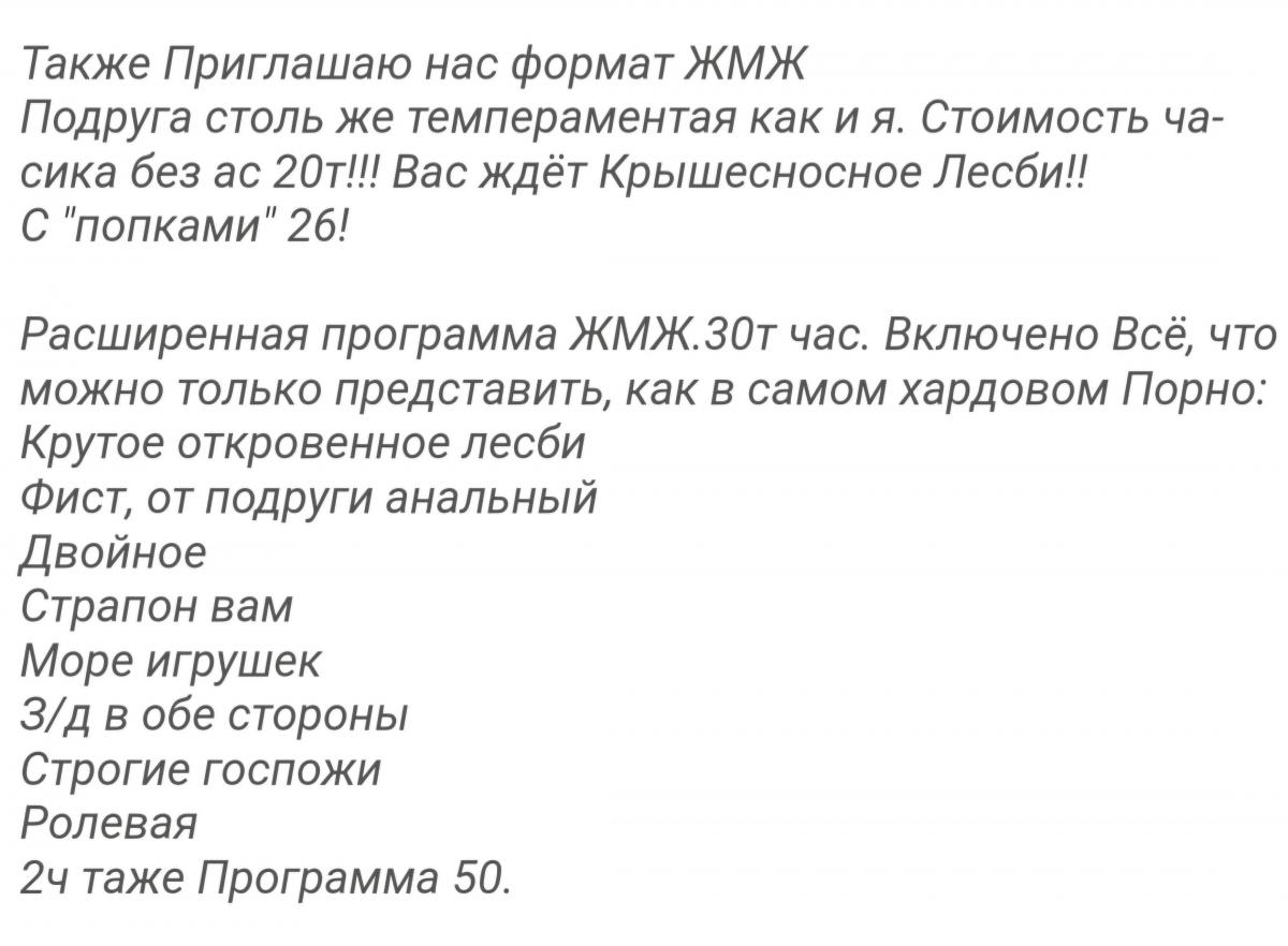 Как вы знаете, с февраля текущего года, я приобщился к теме ЖМЖ. Так что данный вопрос для меня не новый. Решил уточнить детали. Спрашиваю (с надеждой в голосе): «а подружка Лика?» (Лика, которая культуристка, она тоже ведь в районе Лесной, динамила меня не раз и не два. Помню, что был у них с Ольгой… дуэт, так сказать, поэтому и подумал - вдруг возобновили… сотрудничество). Ольга отвечает: "нет, не Лика, записывайся, не пожалешь подруга супер-пупер, будет сказка, все как захочешь, меня знаешь, она тоже супер класс и т.д." Хорошо так нарисовала картину, воспользовалась моей врожденной легкой внушаемостью и легковозбудимостью, и записался я на «расширенную программу», хотя в голове держал программу «с попками». «Расширенная программа» - это, братья по разуму, 30 тысяч за час (тут половина бросила читать