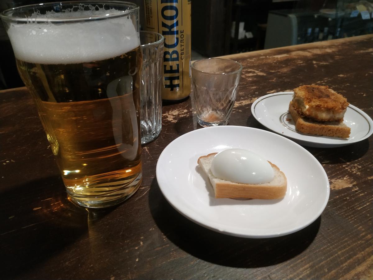 Пиво Жигулёвское (0.5/170р) не советую, ссанина. На эти деньги лучше ещё соточку взять, с соком или бутербродом. Бутербродов много разных, самые нормальные с селёдкой и луком (55р), с колбасой или сыром уже по 60р. С форшмаком тоже за 60р, и можно соблазниться, но он половинчатый, тут надо внимательнее смотреть меню. Из горячего (яичница, жареные пельмени, супы, колбаски, котлета) - ничего не брал. Но оно есть, приносят на стол сами.