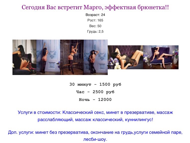 Сходил к Марго перед женским праздником Весны. Т. е. поздним вечером 7-го марта. Кстати салон переехал с Пулковской улицы на Звёздную улицу 11. На кастинге вышло 4 феи. Понравились Ксюша и Марго. Выбор пал на Марго, хз почему. По процессу и ттх скорее соглашусь с афтором. Спросил про мбр, был озвучен ценник в 1,5 кРубля, договорились за 1 кРуб, старалась с окресностями, но меня интересовал результат, отстрел и она убежала в ванну, после перекур, небольшой треп и продолжили в зкп. итого 2500+1000 с мбр/час. остался доволен как удав. Может пойду еще, как минимум к Ксюше, а там видно будет.
